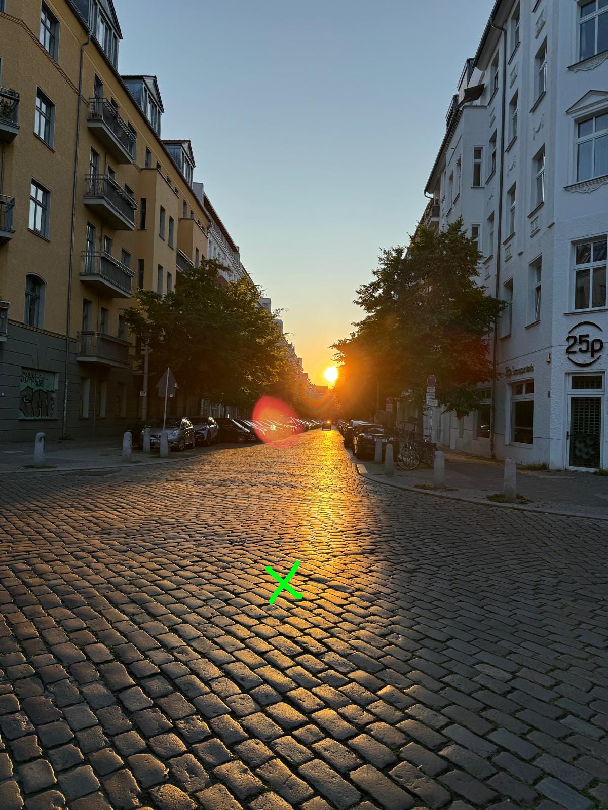 Es ist früher Abend. Eine Frau in einem weißen Haifischkragensommerkleid steht mitten auf einer kleinen Kreuzung. Um sie herum nur Kopfsteinpflaster und diese gerade in diesen Zeiten immer leicht irreale Prenzlauer-Berg-Watteblasen-Idylle. Sie steht dort in einem Lichtdreieck, dem letzten vom Tag übrig Gebliebenen.