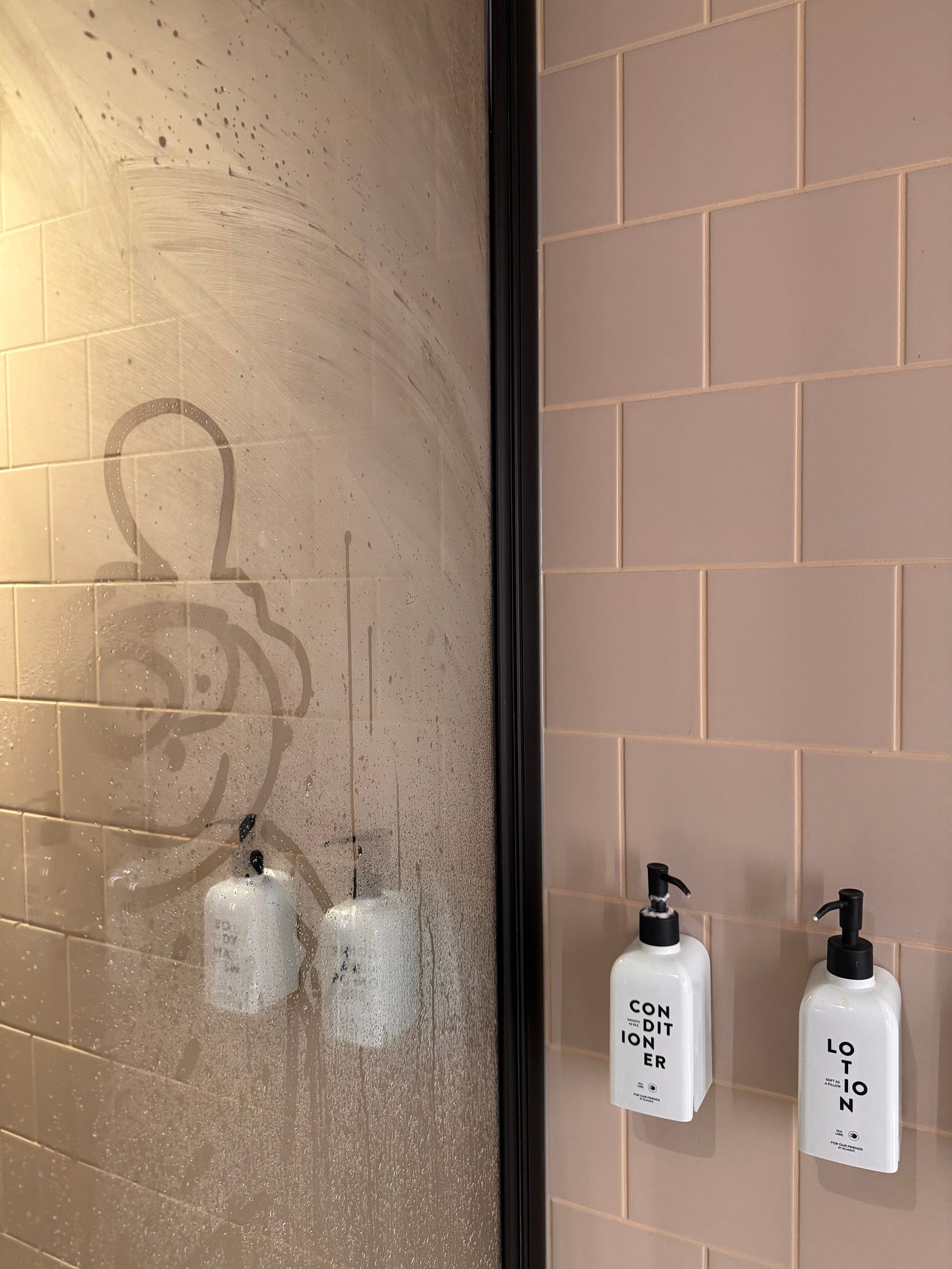 I have a habit of drawing nonsense on every shower wall I encounter, just to coax a small smile from the next person stepping in. Especially in hotels. I love hotels. Is that strange? The thing is, I have no idea whether these doodles reappear with the next wave of steam or simply slide down, like one of those McDonald’s pickle slices in a pickle race, and vanish forever. Or perhaps the next shower guest is a wiper—a person who goes into a wild rage if the glass isn’t scraped spotless with the squeegee. In that case there would be no smile at all, and my mission would have failed entirely.