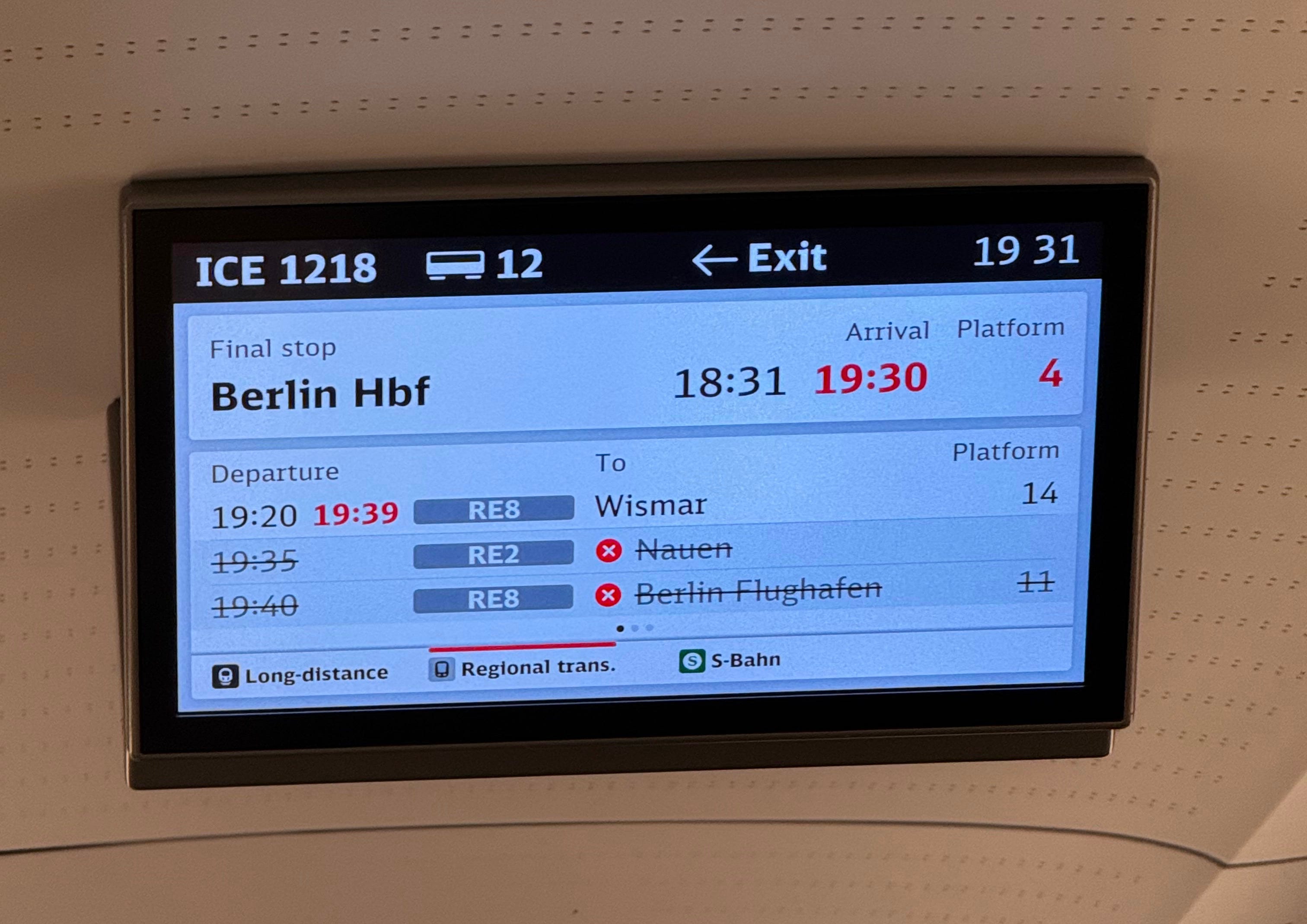 My favourite person and I are sitting on the ICE, eyes fixed on the little screen showing travel updates. On the left: scheduled arrival time. On the right: the actual one. A one-hour delay means a 25% refund.